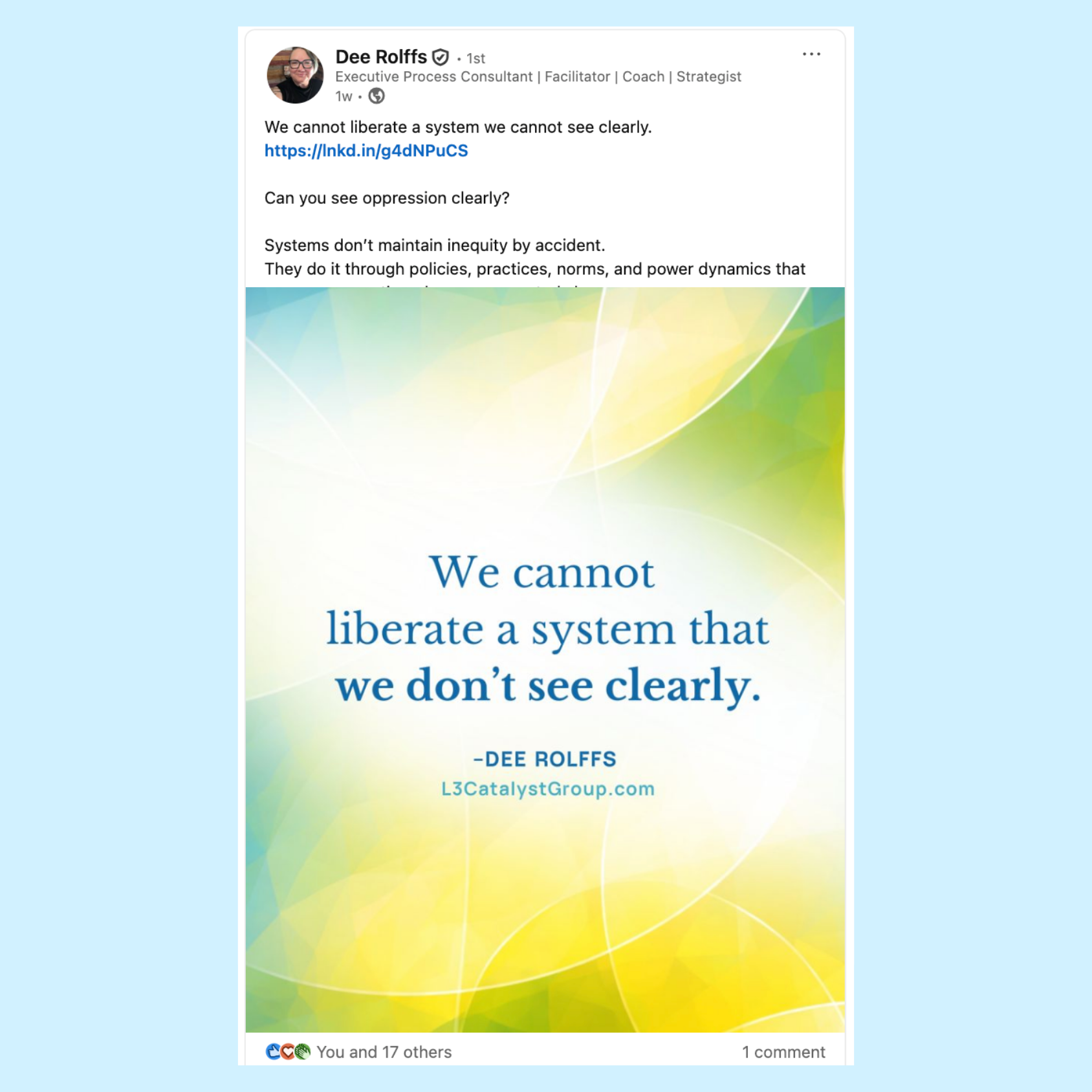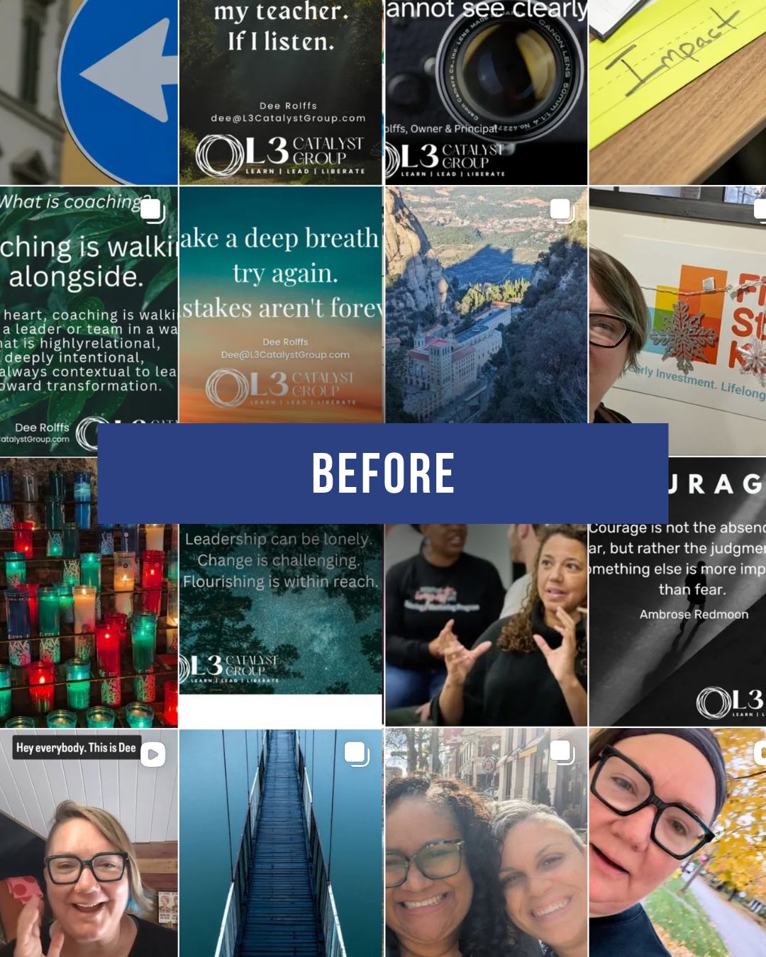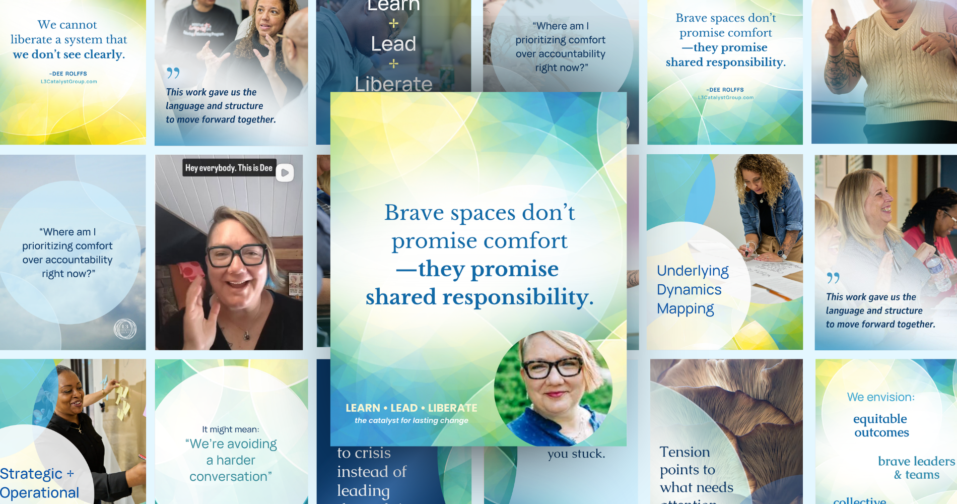 L3 Catalyst Group, led by Dee Rolffs, helps organizations turn equity commitments into embodied, everyday practice. Dee came to me feeling unsure about what to post on social media—they admitted feeling a little all over the place—and how to show up authentically.